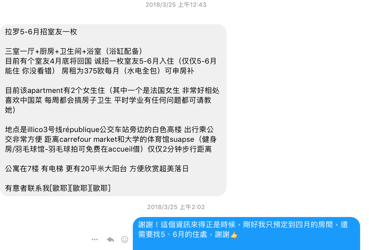 第一個月先在當地熟悉環境後,再透過臉書社團「台灣心法國情」,上面有許多在法國居住的台灣人,可以向他們詢問有沒有租屋的資訊。