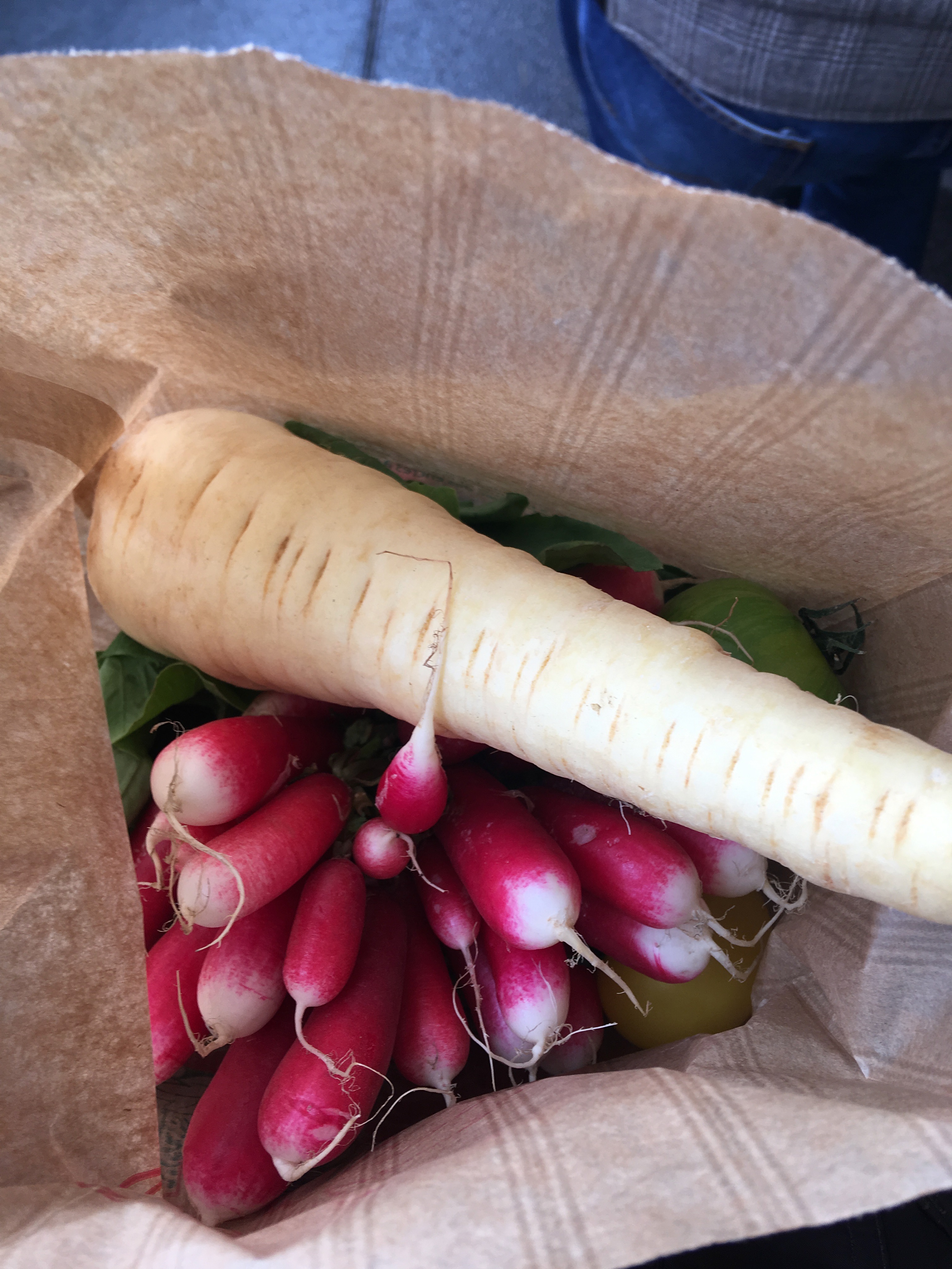 最後,我們買了這些~有一些黃色與綠色的番茄和櫻桃蘿蔔,櫻桃蘿蔔這種蔬菜我是第一次看到,鮮豔粉紅漸層的顏色,與番茄剛好可以搭配成一道彩色的蔬果沙拉,繽紛天然的顏色,感覺有增進食慾的效果呢😋