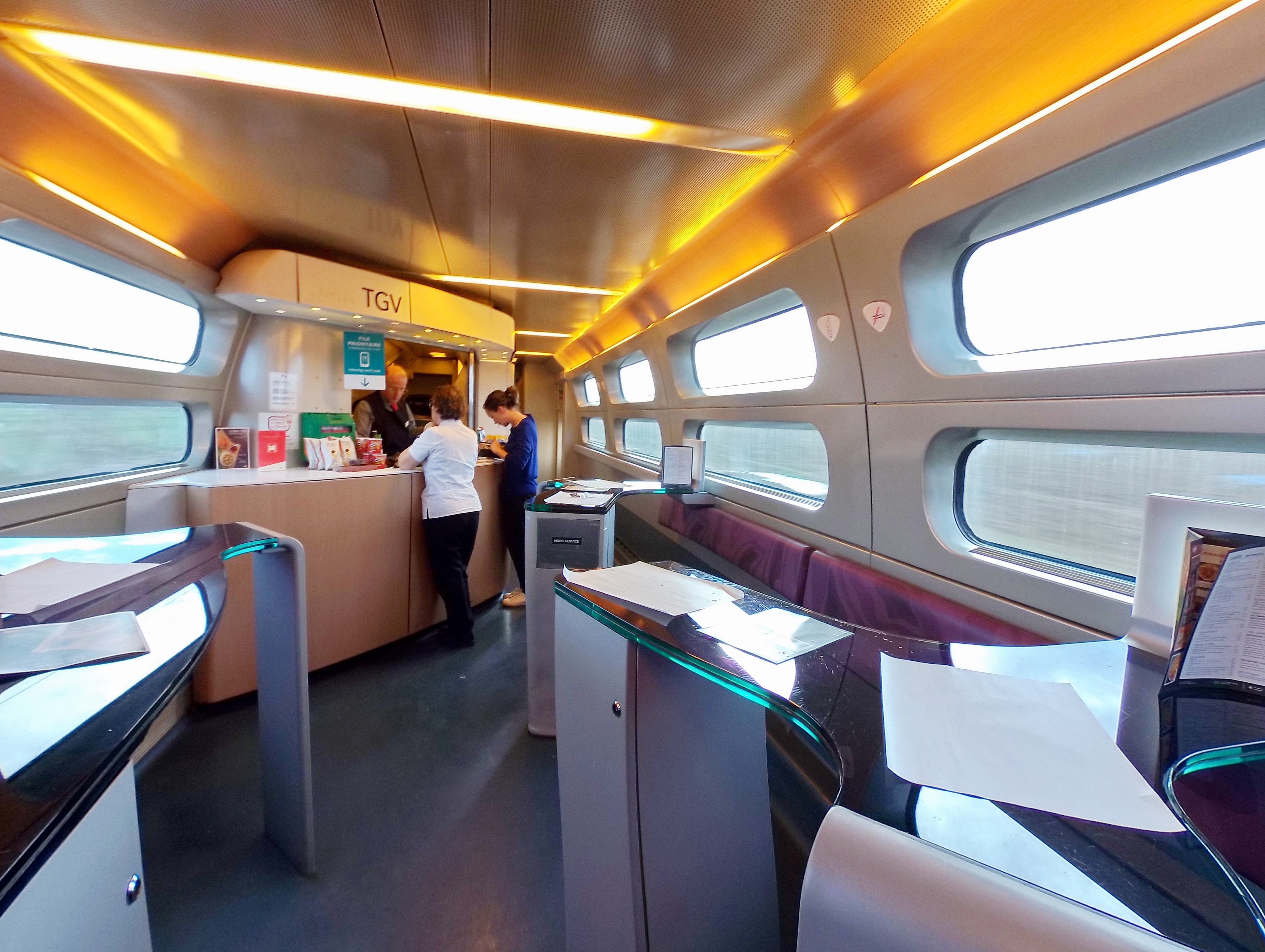 特別的是,在法國不會有火車人員推著餐車或垃圾車來叫賣和收垃圾,垃圾桶在兩張椅子的中間把手下方,代表一個車廂內會有好幾個小垃圾桶。車廂內開放飲食,可以自己帶點心,或是到專屬的「餐車車廂」去購買。