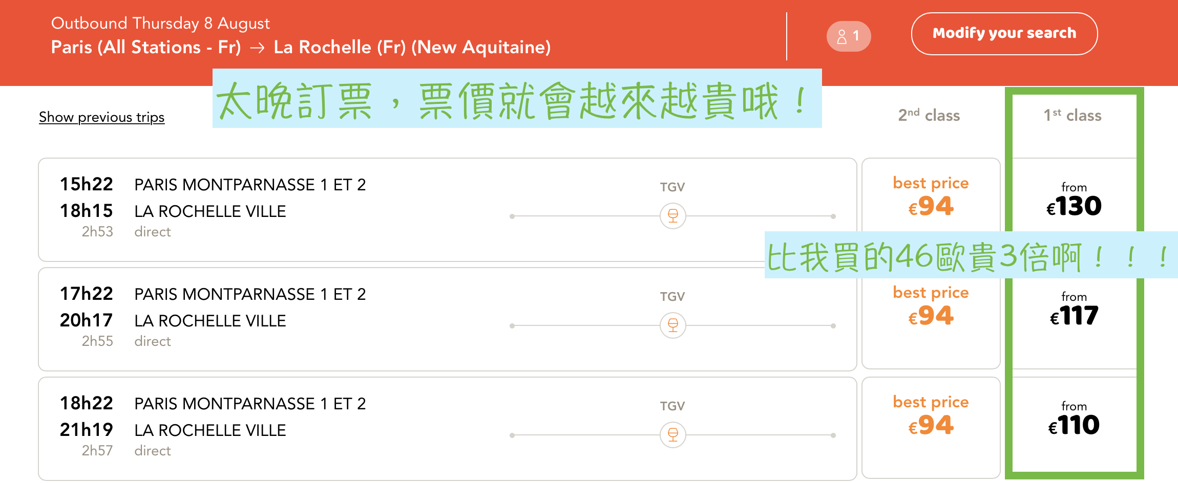 你可能會覺得,票價能差到多少嗎?台灣雖然也有早鳥票,但基本上票價是固定的,然而歐洲的票價通常都是浮動的,越早買越便宜!上面的價格沒有用到任何的卡片優惠,是大家都適用的規則唷!而且,通常離峰的時段,比較容易買到優惠的價格哦!像我訂購的這個班次,雖然是早上7:27的,但如果爬得起來,真的非常的划算呢!