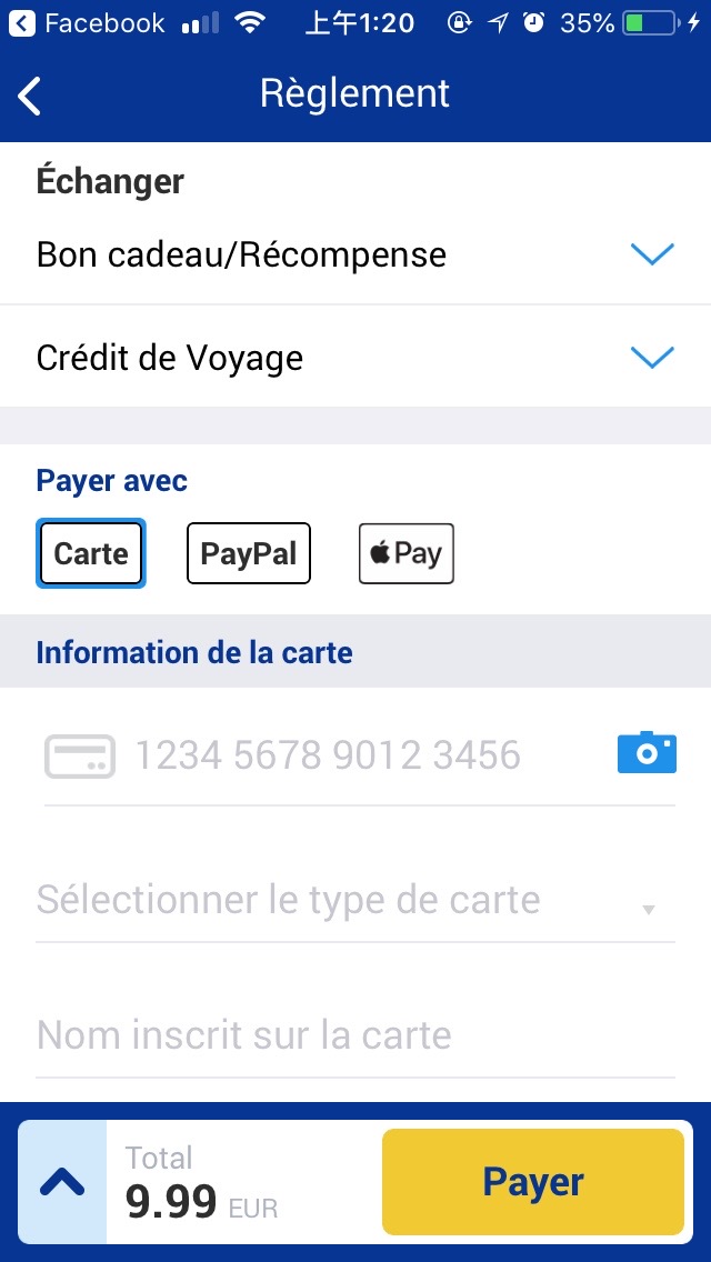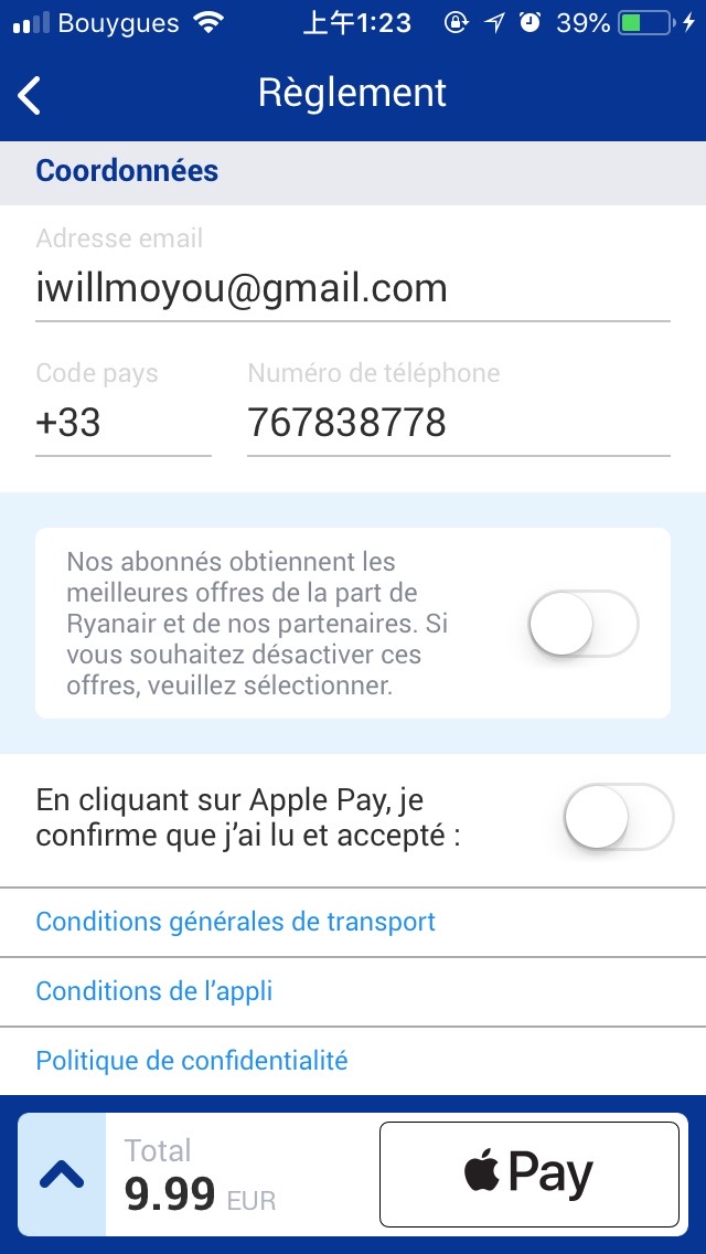 付款也很簡單,在APP內訂購,除了能用信用卡,還能用PayPal跟ApplePay耶!雖然是廉航,但付款的方式挺方便的嘛~😏