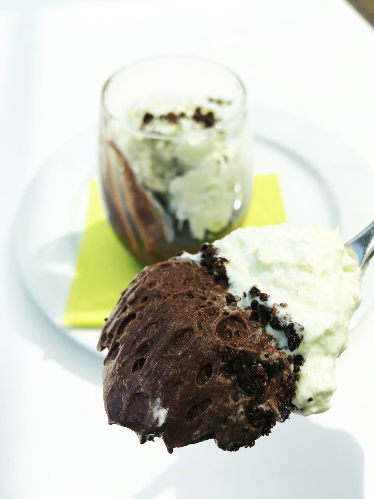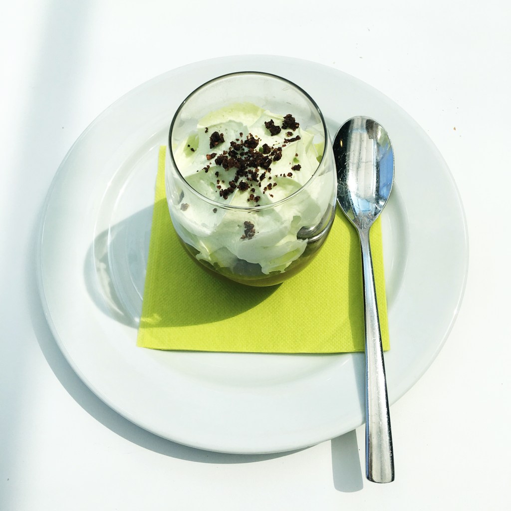 而最期待的甜點是以巧克力慕斯為主體,搭配上歐洲獨有的香草Tarragon(香艾菊,別名法國茵陳蒿)奶油,最後在撒上些許海鹽巧克力碎片。