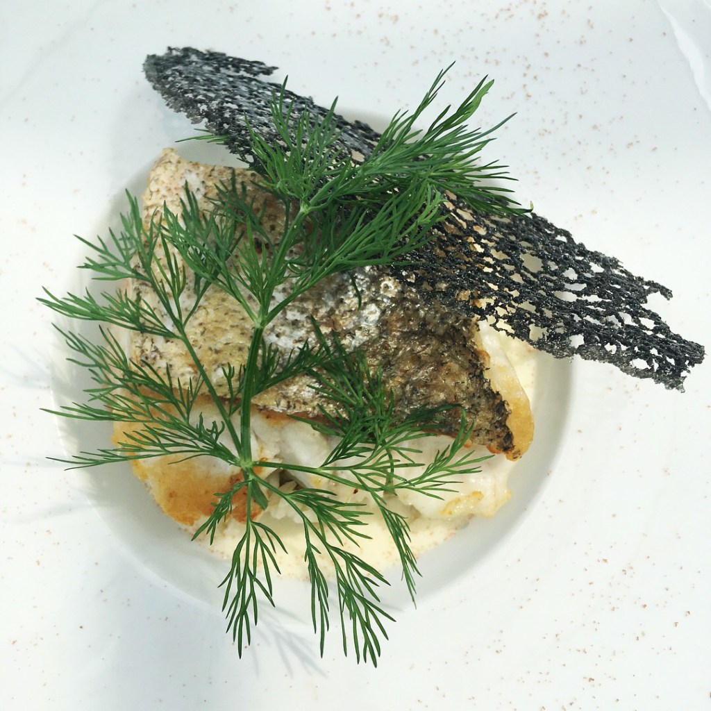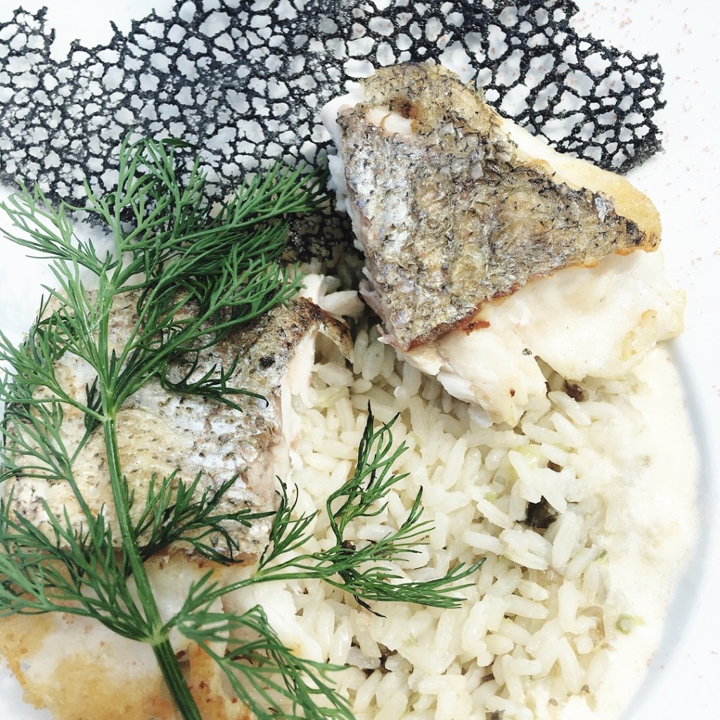 我選的這份是白醬煎魚燉飯,魚肉非常新鮮,而且濃郁的白醬與松露交織成非常迷人的香氣。更特別的是,黑色的這塊網狀物,原本以為是麵粉去烤的裝飾物,但意外地充滿魚的鮮味,可能是用這塊魚煎好後的湯汁去料理的,非常適合與燉飯搭配在一起享用!