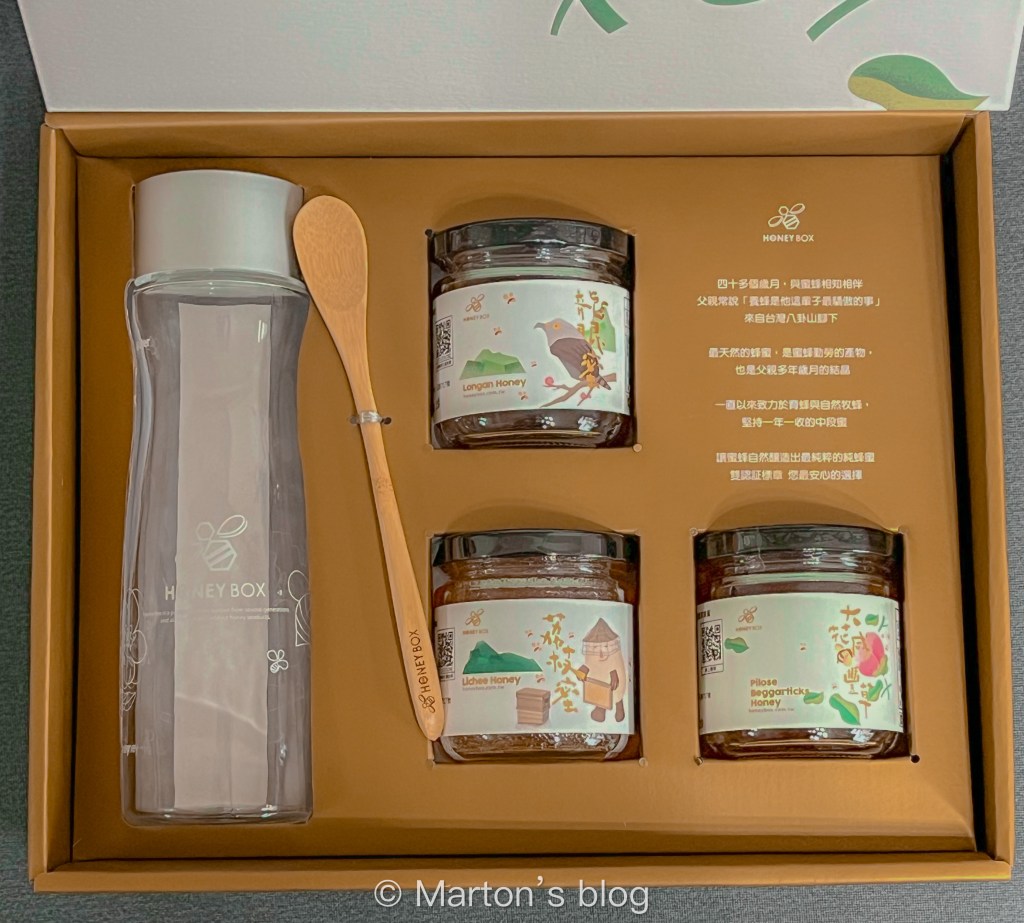 這款禮盒主打的是簡單輕鬆泡出好喝的蜂蜜茶,為了這些跟我一樣,泡蜂蜜茶常常抓不到比例而困擾的人,精心設計的黃金比例水瓶組,可以方便地泡出好喝的蜜茶!