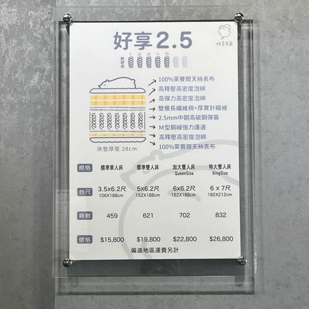 像是這兩張床墊,門市人員就詳細地跟我們介紹到,名稱的數字代表著不同的意義,舉例來說,「好享2.5」的床墊內,使用的是2.5mm中鋼高碳鋼彈簧數量621顆;「好享1.8s」的床墊,則是使用了1.8mm中鋼高碳鋼小彈簧數量1080顆,讓人能清楚一目了然地知道,現在躺的床是什麼組成。