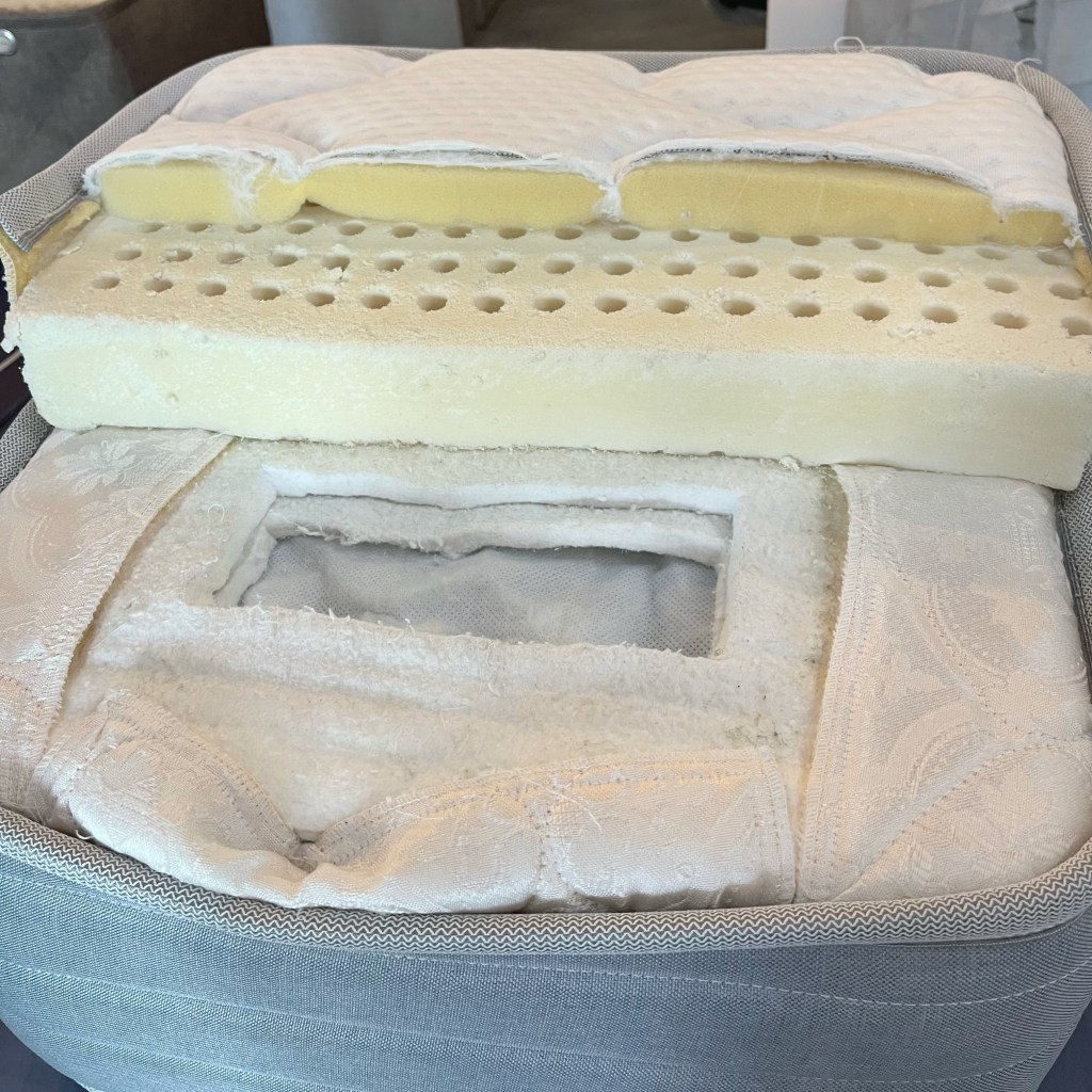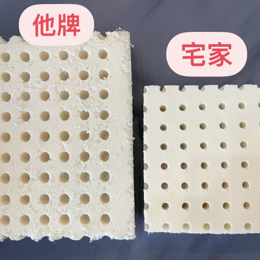 讓我最喜歡的是他們家的乳膠床墊,當門市人員拿出其他廠商的乳膠來做對比時,他牌的乳膠有裁切過,氧化速度很明顯快很多,看起來就破破爛爛、充滿裂痕,在氣孔的密度與分佈上,也明顯不如好享宅家床墊使用乳膠密度高達75kg/m3,是醫療等級下來最適合睡眠的密度,純度90%的Latex泰國天然乳膠。
