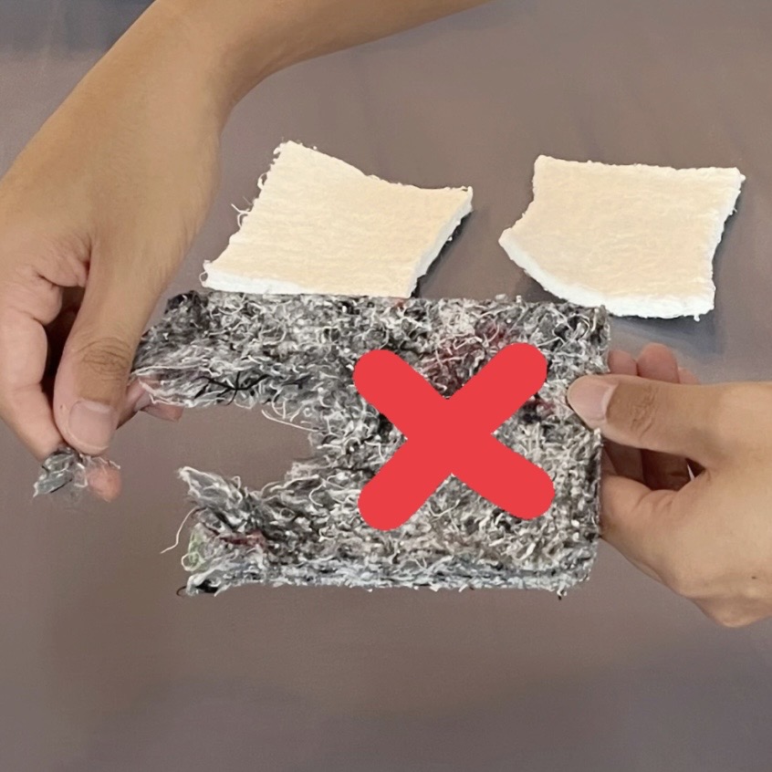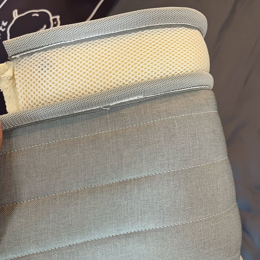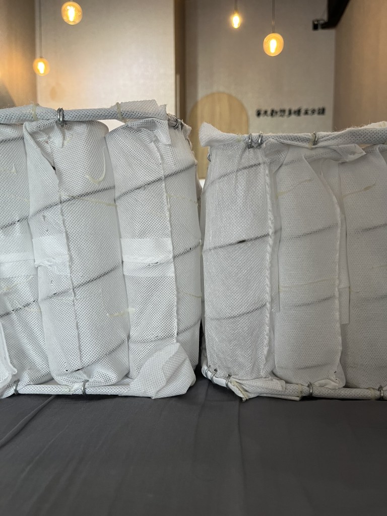 像是下面這幾張照片,就是門市人員在介紹說,有些店家會使用舊布打製而成的短纖維棉(黑色),放在床墊中使用,容易因為翻身就導致碎裂,而易發生塌陷問題,也容易因為上下床晃動產生棉絮,造成過敏現象。而好享宅家全床墊系列都是使用兩層白色長纖維棉,好的材質,厚實更強韌,也不會因為翻身導致碎裂的問題,讓床墊更耐用!