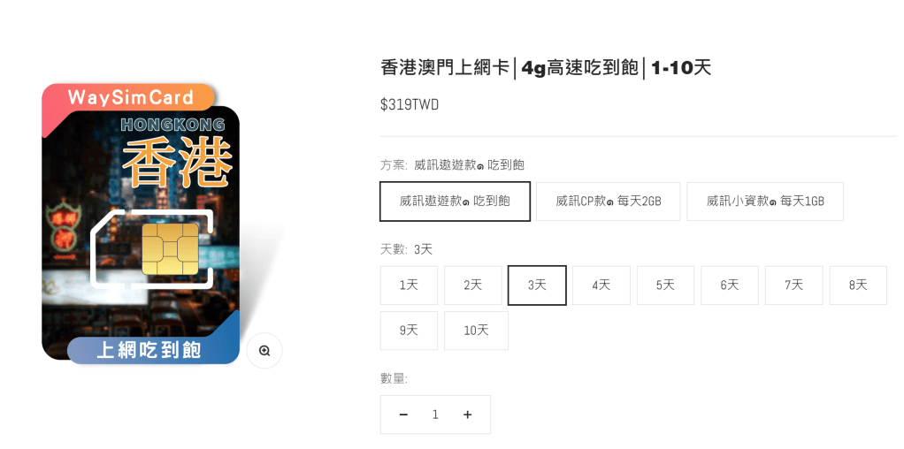 我們這次去香港三天兩夜的行程,使用的是「威訊WaySim」的「香港澳門4g高速吃到飽網卡」,可以先在威訊WaySim的官網先做選擇與預定,天數從1~10天都可以任選呢!