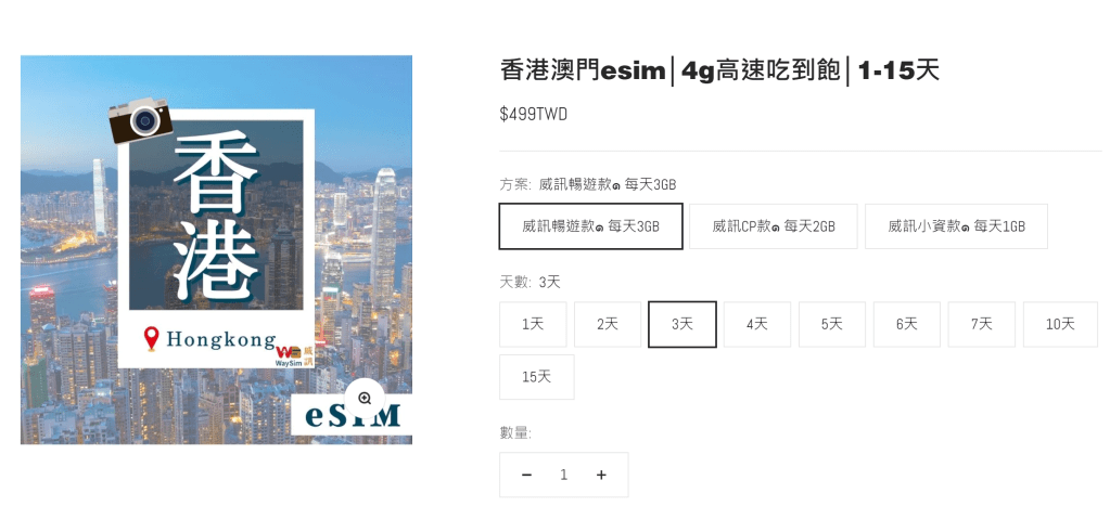 因為我們這次去香港的旅程,我的手機剛好可以支援使用eSIM,於是我就想說來試試看許多人推薦的eSIM到底多方便。所以,我同樣在威訊WaySim的官網上選擇了這款「香港澳門4G高速吃到飽的esim」。