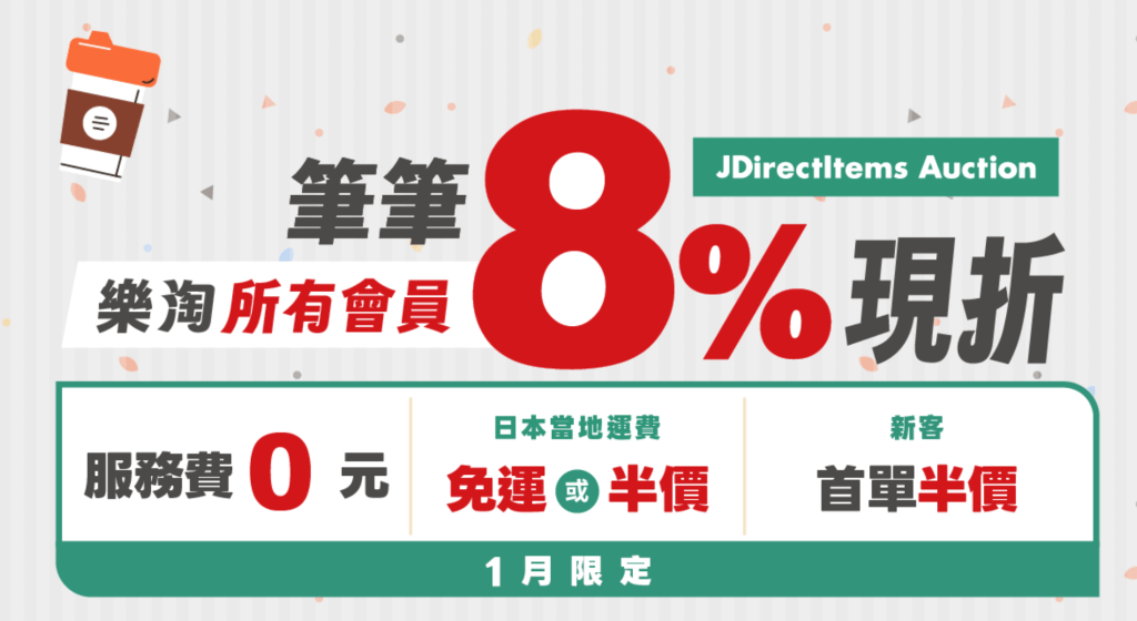 活動期間內所有會員於JDirectItems Auction代標,不限金額8%OFF現折,上限折20,000日幣。