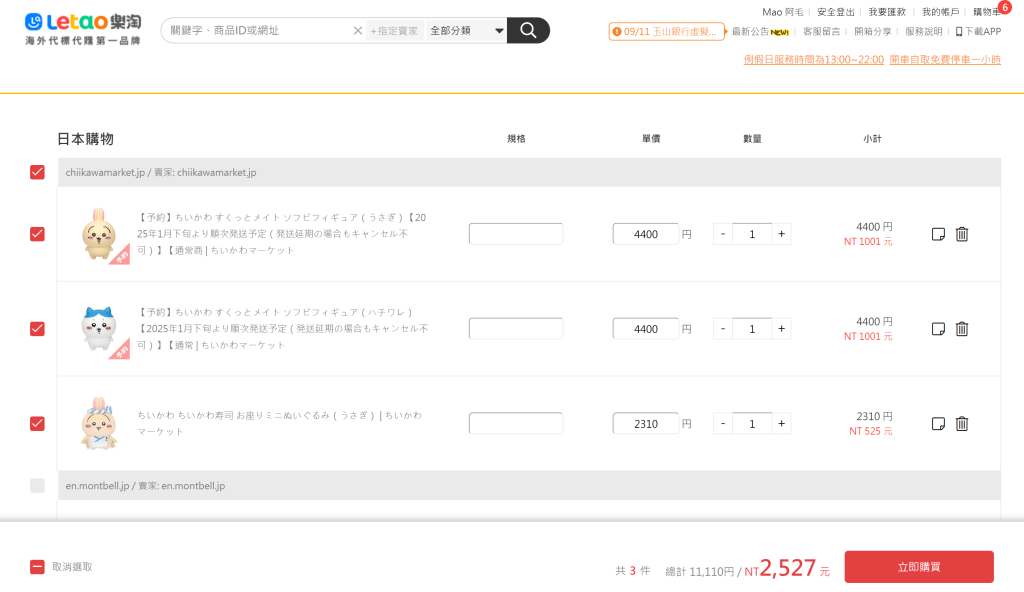 決定好數量與款式後,就可以直接加入購物車,購物車內就能看到所有已選擇的吉伊卡哇商品,包含款式、數量與台幣價格等資訊,一次就能全部檢視完成。