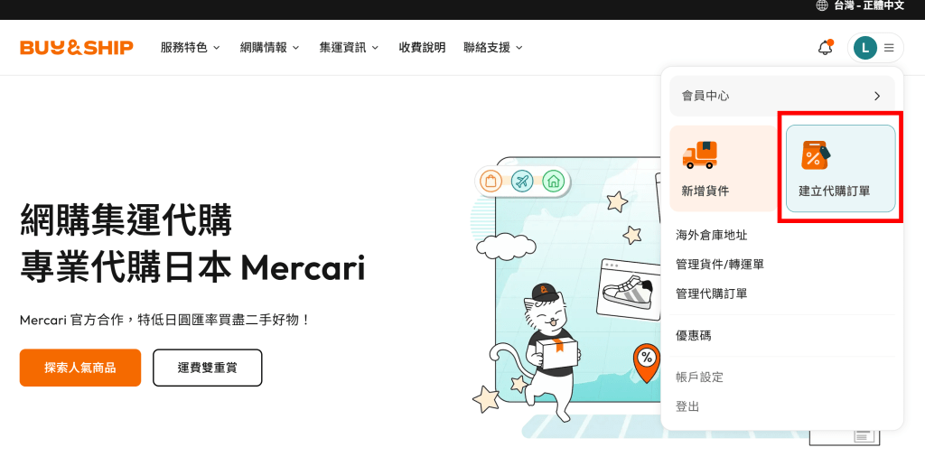 登入會員後,點開右上角的功能列,接著點選「建立代購訂單」