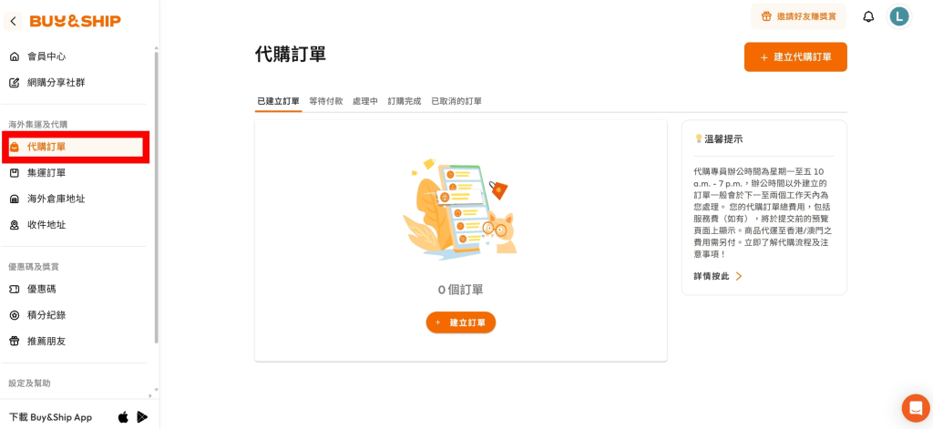 接著,點選左側的「代購清單」後,再點右上角橘色框框的「建立代購訂單」