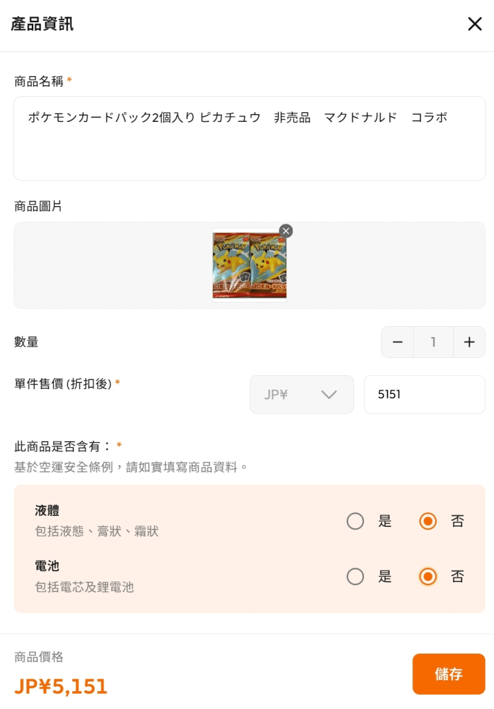 Buy&Ship的系統就會自動抓取商品的資訊,自動顯示商品價格與名稱和圖片,確認想要購買的數量與其他資訊都正確無誤後,就可以按下儲存按鈕: