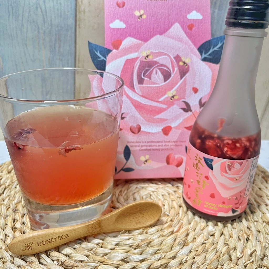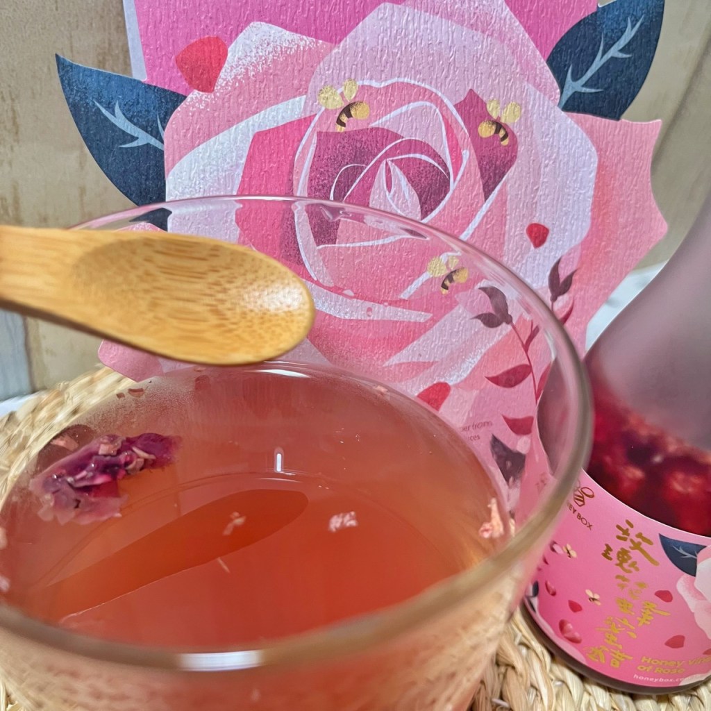 裡面貼心附有調配的比例說明,我馬上就嘗試了玫瑰花蜂蜜醋的調製步驟,以冷(冰)開水3-5倍沖泡以稀釋濃度,簡單地就能完成一杯馥郁芬芳的玫瑰花蜂蜜醋飲。