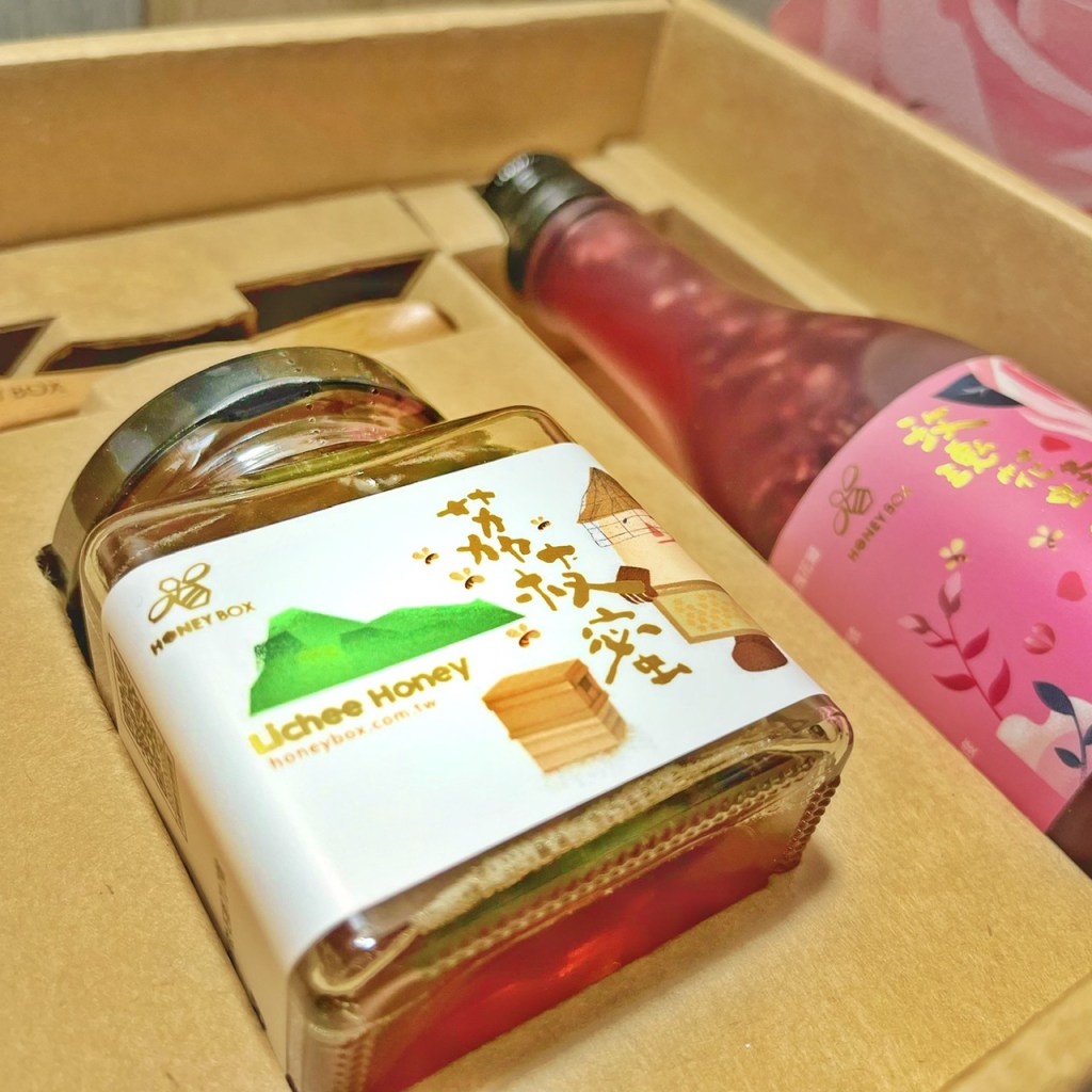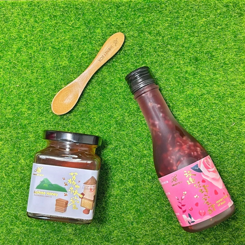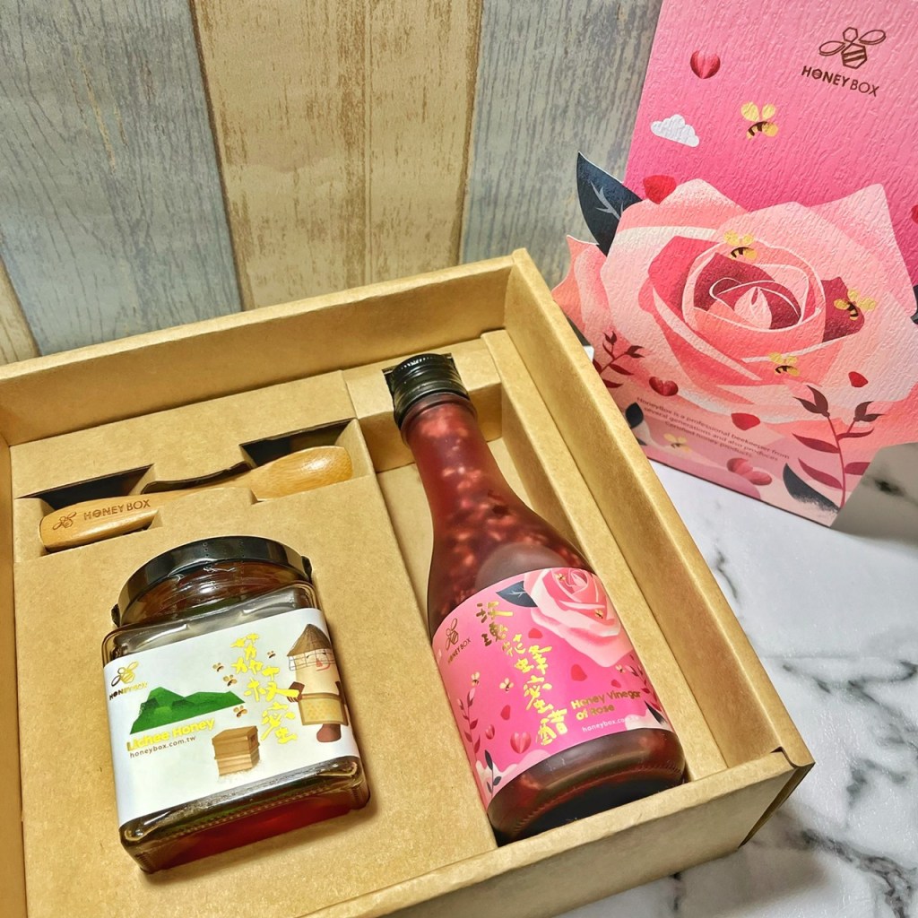 裏面的東西更是驚艷,打開粉紅玫瑰禮盒後,不僅有 國產認証荔枝蜜240g + 玫瑰花蜂蜜醋180ml,還有一把超可愛的竹湯匙~